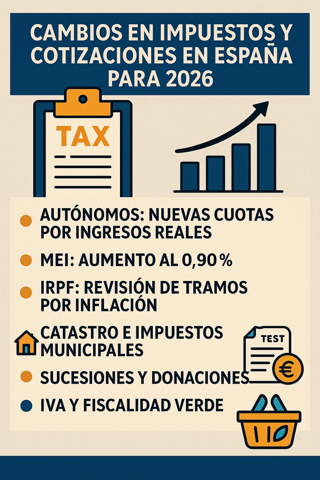 Las cuotas de autónomos seguirán ajustándose al sistema de ingresos reales, el MEI subirá hasta el 0,90 %, el IRPF se actualizará un 3–4 % por inflación y muchos ayuntamientos revisarán el Catastro, encareciendo el IBI entre un 2 % y un 12 %.